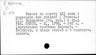 ИНИОН РАН ИМИДЖ-КАТАЛОГ ОББО ИНИОН РАН Отдел ББО при Институте мировой экономики и международных отношений... Систематический каталог Европа. Внешняя политика. История. Национальные проблемы. Колониаль... Европа. Национальная проблема. Этнические вопросы