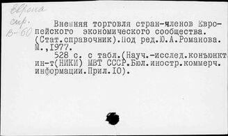 ИНИОН РАН ИМИДЖ-КАТАЛОГ ОББО ИНИОН РАН Отдел ББО при Институте мировой экономики и международных отношений... Систематический каталог Европа. Внешняя экономика. Внешняя торговля. Международные финансы Европа. Торговля между капиталистическими и социалистическими странами