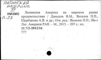 ИНИОН РАН ИМИДЖ-КАТАЛОГ ОББО ИНИОН РАН Отдел ББО при Институте мировой экономики и международных отношений... Систематический каталог Латинская Америка. Промышленность. Сельское хозяйство. Транспорт и ... Латинская Америка. Торговля продуктами сельского хозяйства