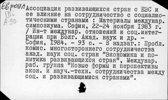 ИНИОН РАН ИМИДЖ-КАТАЛОГ ОББО ИНИОН РАН Отдел ББО при Институте мировой экономики и международных отношений... Систематический каталог МСС. Внешняя политика. Военные вопросы. Финансы и международная эко... МСС. Внешнеэкономические связи с развитыми странами